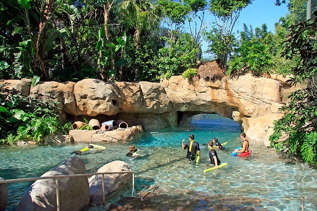 | O Discovery Cove possui rios e piscinas para mergulho |